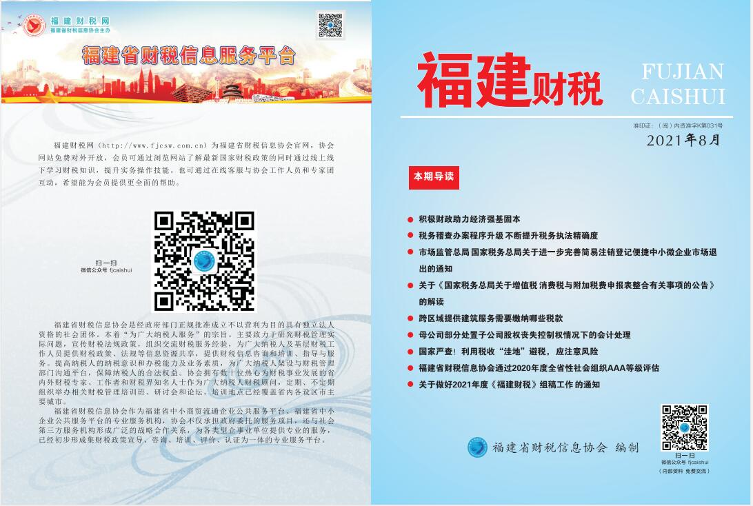 《福建財(cái)稅》(準(zhǔn)印證:(閩)內(nèi)資準(zhǔn)字K第031號(hào))由福建省財(cái)稅信息協(xié)會(huì)主辦,為省級(jí)連續(xù)性資料性出版物,集專(zhuān)業(yè)性、指導(dǎo)性、學(xué)習(xí)性于一體。采用大16開(kāi)本國(guó)際流行印刷,每期約120碼,自2014年編印以來(lái)已累計(jì)發(fā)行共20多萬(wàn)冊(cè)。內(nèi)容主要包括財(cái)稅動(dòng)態(tài)、政策與解讀、納稅輔導(dǎo)、涉稅會(huì)計(jì)、稅收籌劃、風(fēng)險(xiǎn)管理、問(wèn)題答疑、協(xié)會(huì)動(dòng)態(tài)、會(huì)員風(fēng)采等欄目。主要面向本省財(cái)稅系統(tǒng)干部、高等院校財(cái)稅專(zhuān)業(yè)講師、會(huì)員單位以及財(cái)稅從業(yè)人員交流使用。