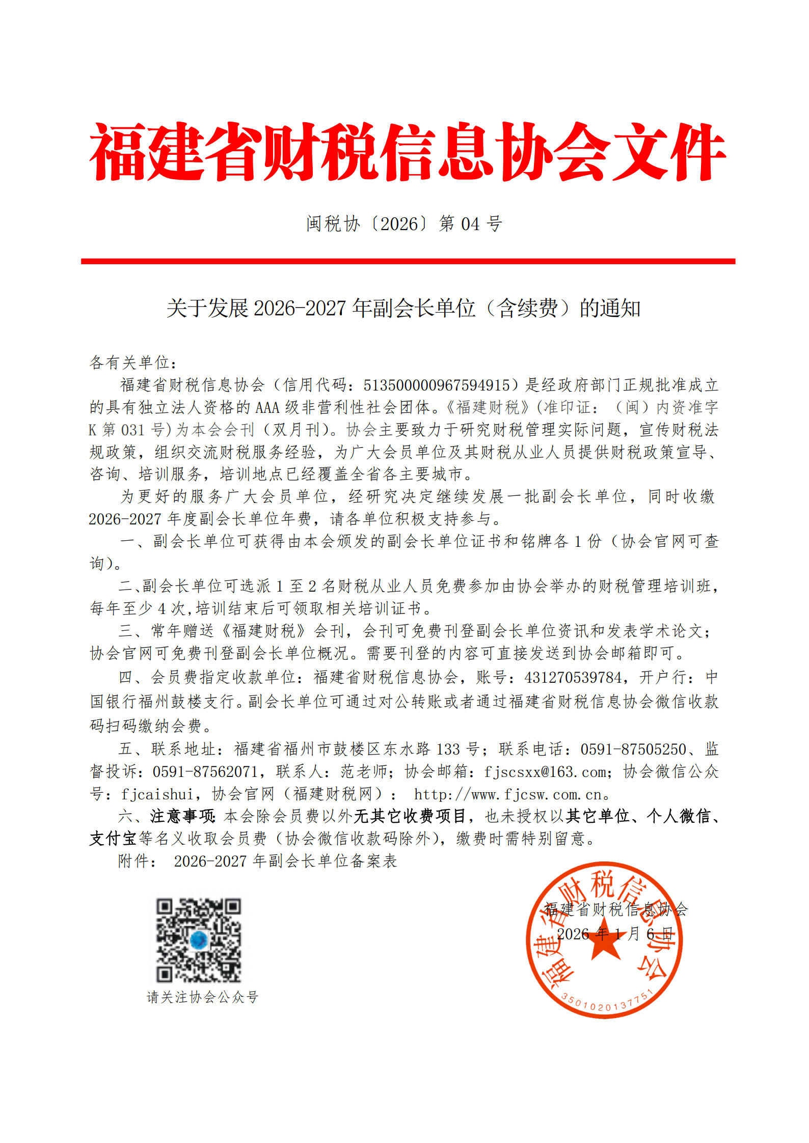 福建省財稅信息協(xié)會(信用代碼:513500000967594915)是經(jīng)政府部門正規(guī)批準成立的具有獨立法人資格的AAA級非營利性社會團體?!陡=ㄘ敹悺?準印證:(閩)內(nèi)資準字K第031號)為本會會刊(雙月刊)。協(xié)會主要致力于研究財稅管理實際問題,宣傳財稅法規(guī)政策,組織交流財稅服務(wù)經(jīng)驗,為廣大會員單位及其財稅從業(yè)人員提供財稅政策宣導、咨詢、培訓服務(wù),為更好的服務(wù)廣大會員單位,經(jīng)研究決定繼續(xù)發(fā)展一批副會長單位,同時收繳2026-2027年度副會長單位年費,請各單位積極支持參與。