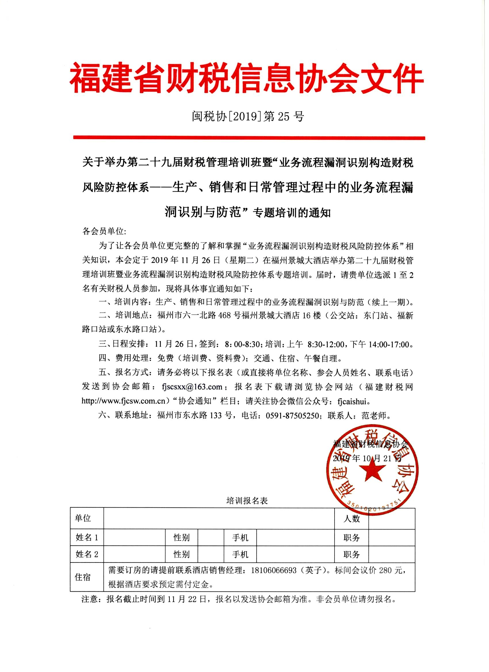 為了讓各會員單位更完整的了解和掌握“業(yè)務(wù)流程漏洞識別構(gòu)造財稅風(fēng)險防控體系”相關(guān)知識,本會定于2019年11月26日(星期二)在福州景城大酒店舉辦第二十九屆財稅管理培訓(xùn)班暨業(yè)務(wù)流程漏洞識別構(gòu)造財稅風(fēng)險防控體系專題培訓(xùn)。