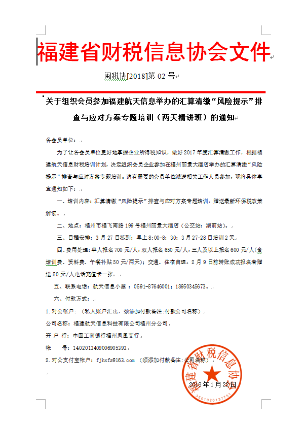 關(guān)于組織會員參加福建航天信息舉辦的匯算清繳“風(fēng)險(xiǎn)提示”排查與應(yīng)對方案專題培訓(xùn)(兩天精講班)的通知