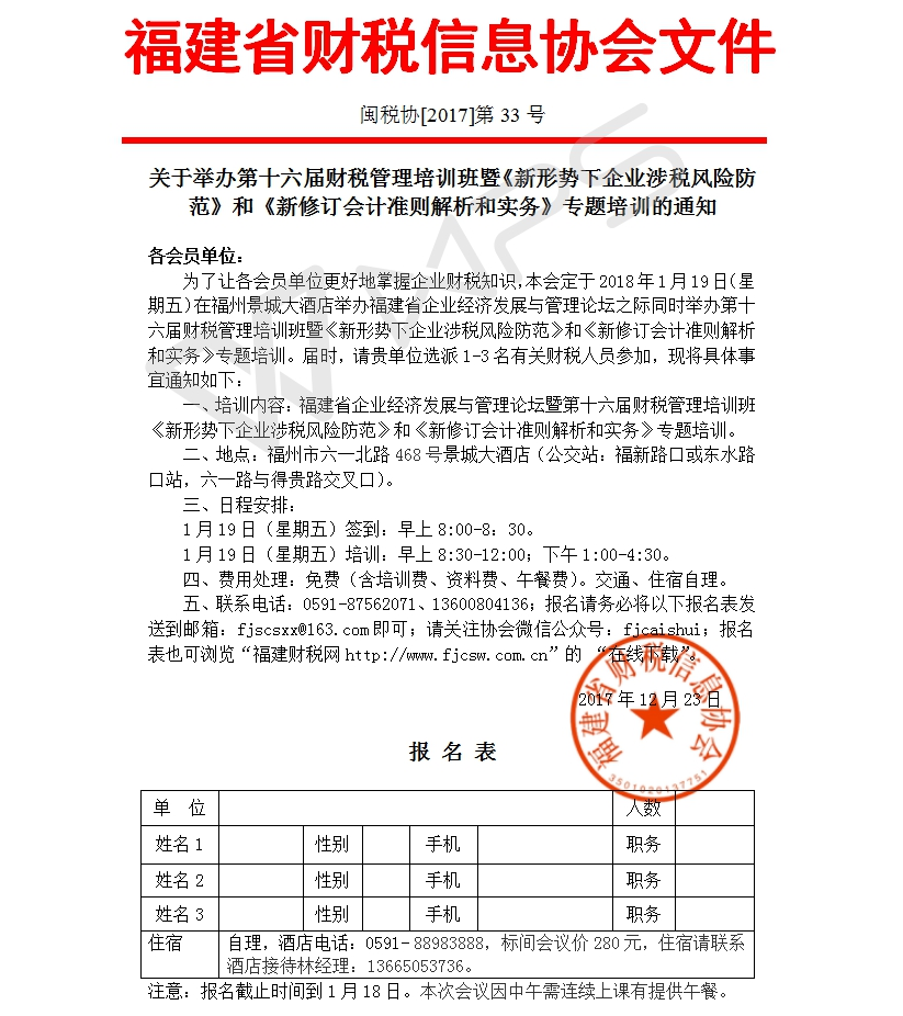 為了讓各會員單位更好地掌握企業(yè)財(cái)稅知識,本會定于2018年1月19日(星期五)在福州景城大酒店舉辦福建省企業(yè)經(jīng)濟(jì)發(fā)展與管理論壇之際同時(shí)舉辦第十六屆財(cái)稅管理培訓(xùn)班暨《新形勢下企業(yè)涉稅風(fēng)險(xiǎn)防范》和《新修訂會計(jì)準(zhǔn)則解析和實(shí)務(wù)》專題培訓(xùn)。