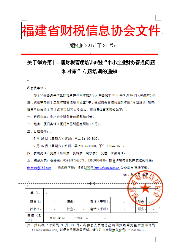 為了讓各會員單位更好地掌握企業(yè)財稅知識,本會定于2017年9月16日(星期六)在廈門賓館舉辦第十二屆財稅管理培訓班暨“中小企業(yè)財務管理問題和對策”專題培訓。
