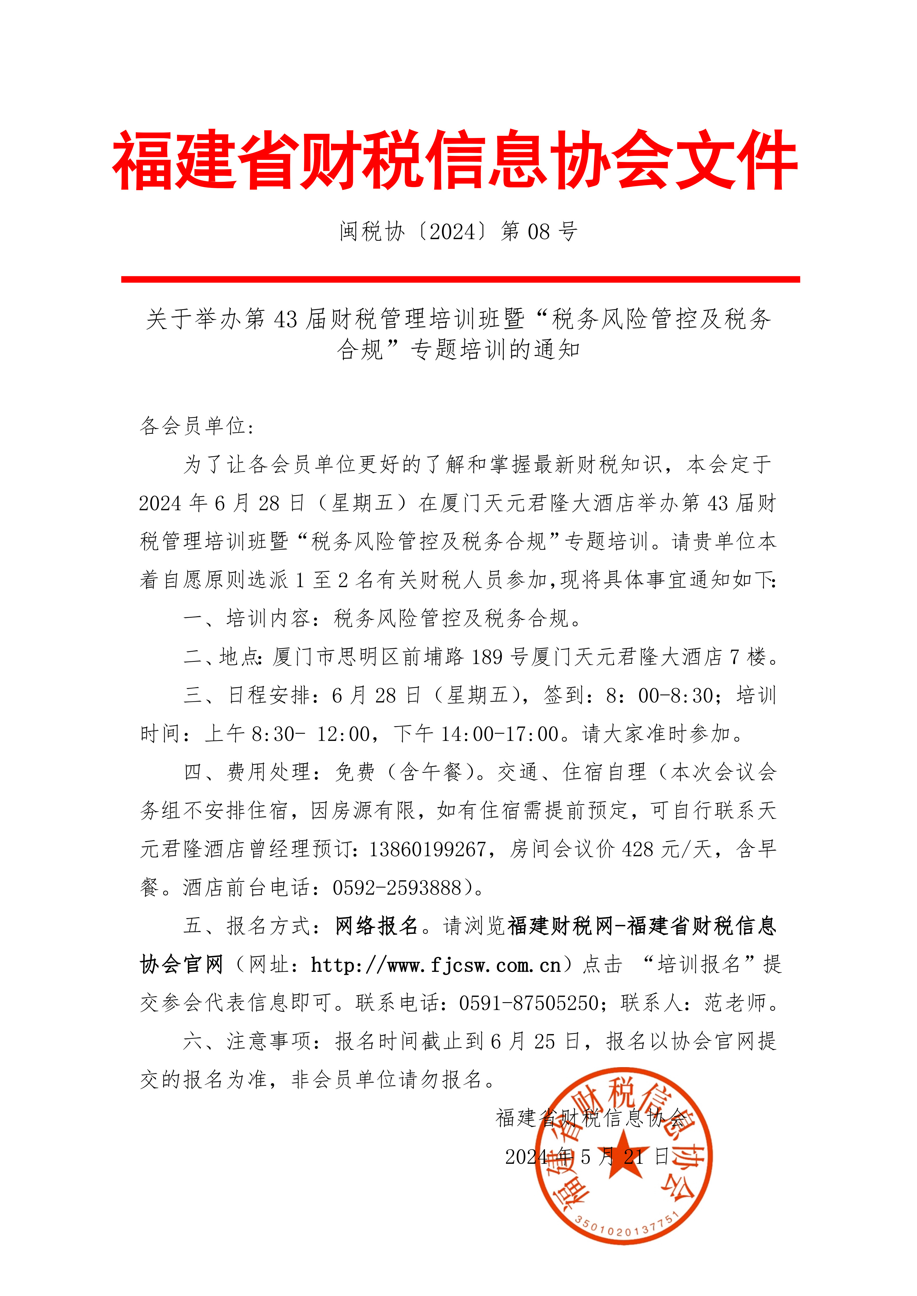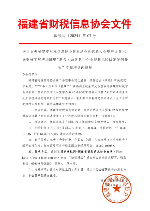 為了讓各會員單位更好的了解和掌握最新財稅知識,本會定于2024年9月7日(星期六)在福州世紀(jì)金源大飯店舉辦第44屆財稅管理培訓(xùn)班,請貴單位本著自愿原則選派1至2名有關(guān)財稅人員參加。