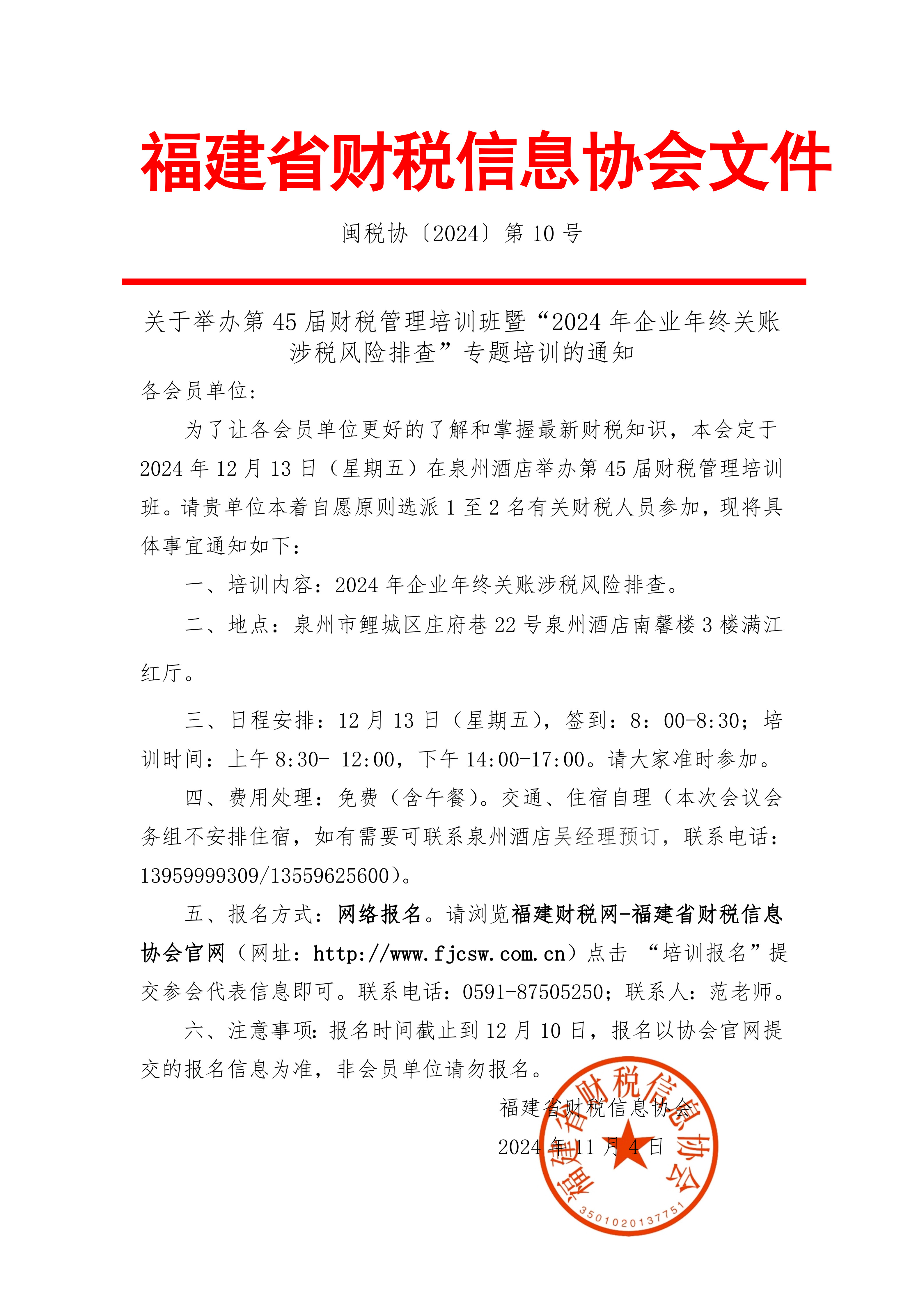 關(guān)于舉辦第45屆財稅管理培訓(xùn)班暨“2024企業(yè)年終關(guān)賬涉稅風(fēng)險排查”專題培訓(xùn)的通知
