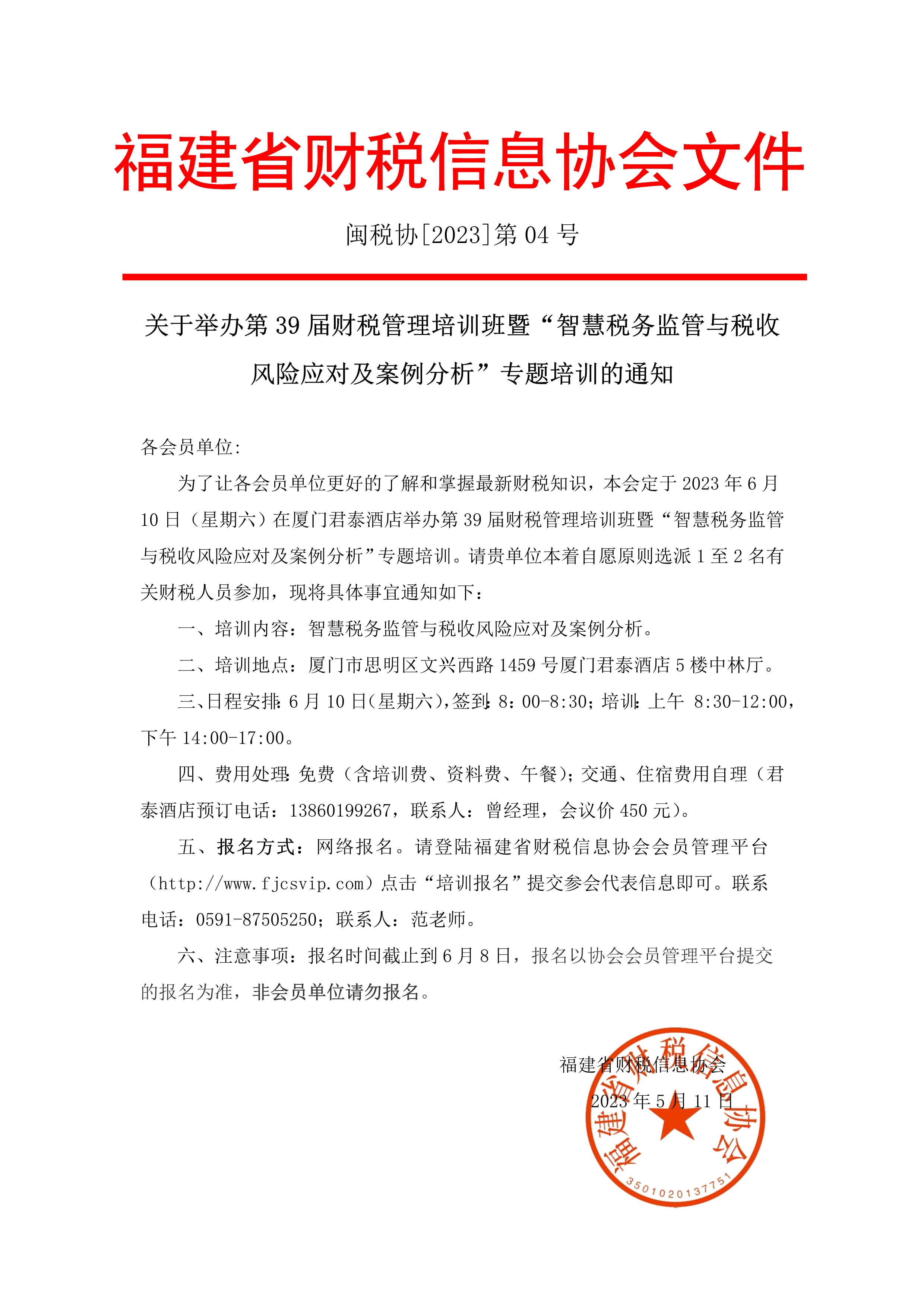 為了讓各會(huì)員單位更好的了解和掌握最新財(cái)稅知識(shí),本會(huì)定于2023年6月10日(星期六)在廈門君泰酒店舉辦第39屆財(cái)稅管理培訓(xùn)班暨“智慧稅務(wù)監(jiān)管與稅收風(fēng)險(xiǎn)應(yīng)對(duì)及案例分析”專題培訓(xùn)。