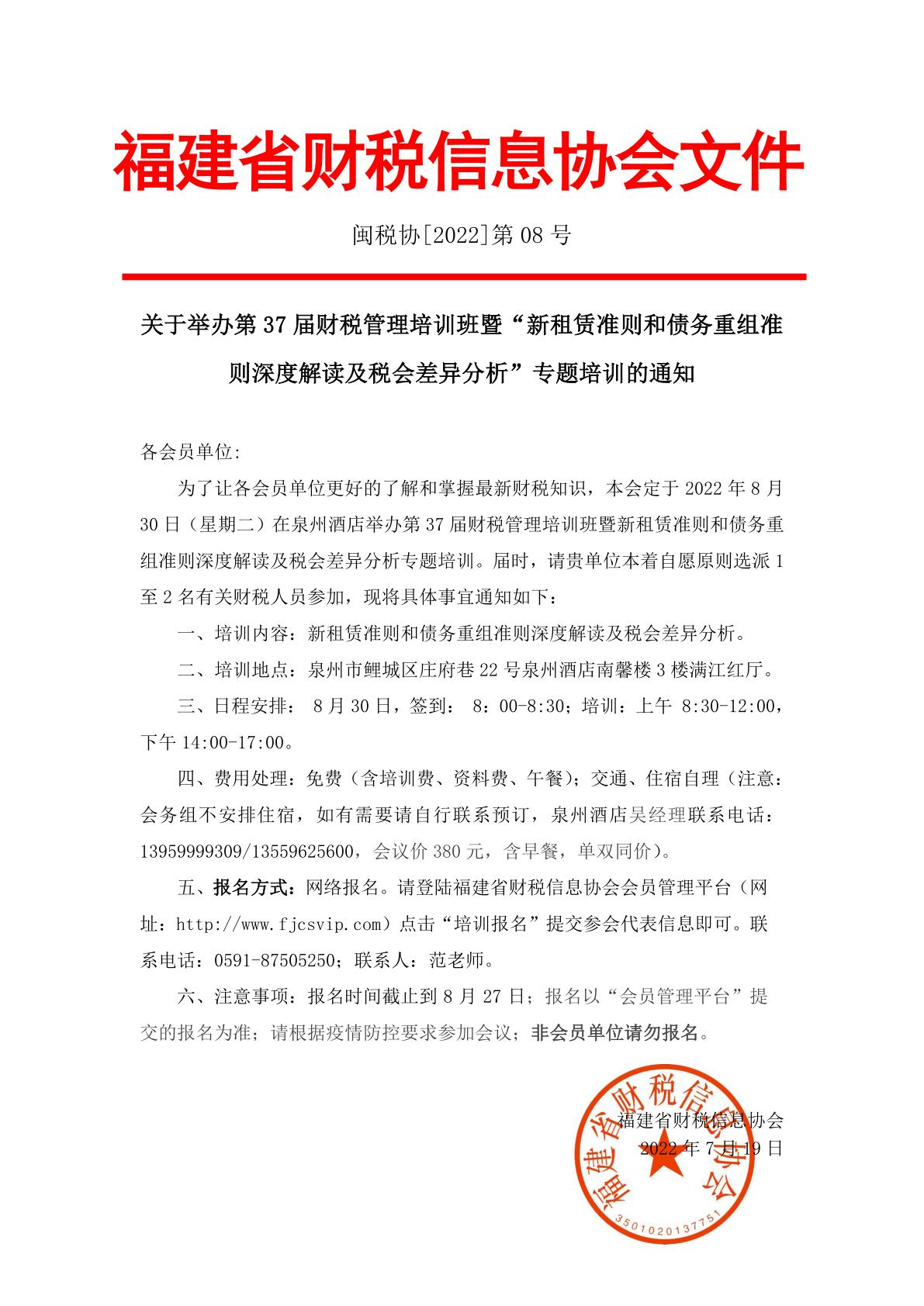 關(guān)于舉辦第37屆財稅管理培訓班暨“新租賃準則和債務(wù)重組準則深度解讀及稅會差異分析”專題培訓的通知